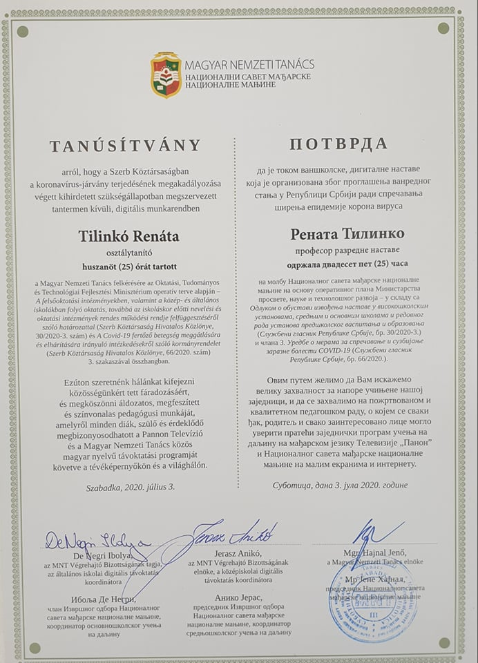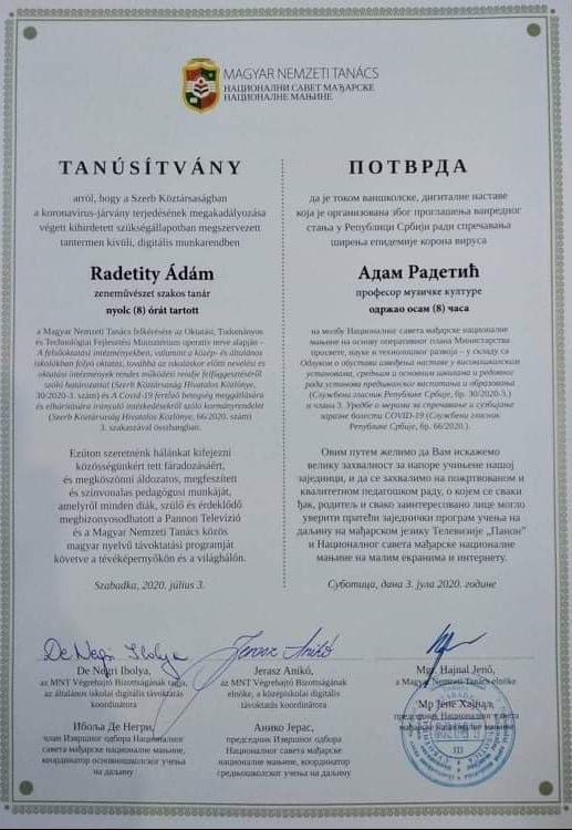 A Magyar Nemzeti Tanács 2020. július 3-án ünnepélyes keretek között megköszönte Tilinkó Renáta osztálytanítónak és Radetity Ádám zenetanárnak áldozatos és színvonalas pedagógusi munkáját, melyet a távoktatás ideje alatt nyújtottak közösségünknek.